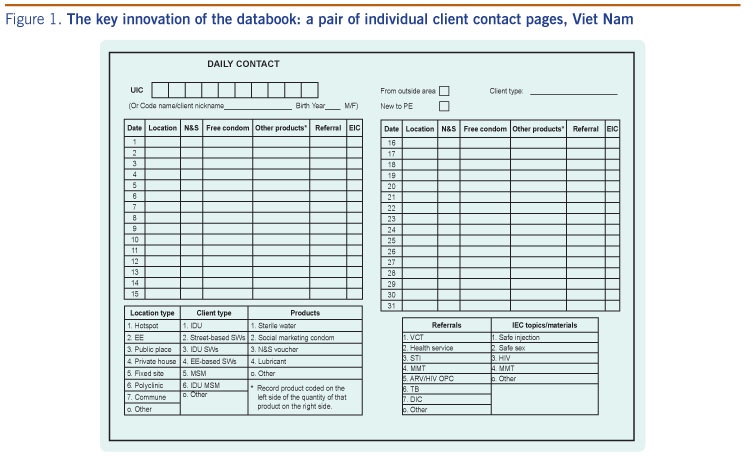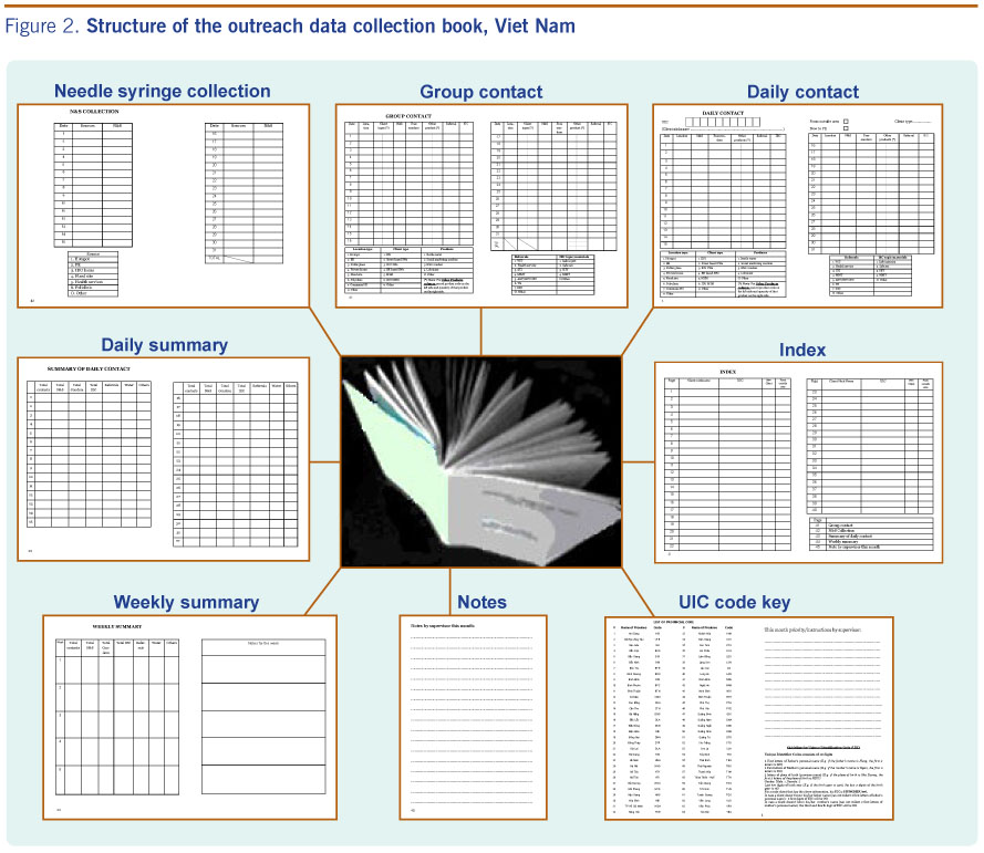 Action: This paper describes the development of a Unique Identifier Code (UIC), a field data collection notebook (databook)and a computer data entry system in Viet Nam. The databook can document 40 individual clients and has space forcommodity distribution, group contacts and needles/syringe collection for each month.