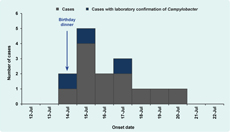 All 57 guests responded to the investigation questionnaire (100% response rate). Fifteen met the case definition. The epidemic curve (Figure 1) indicates illness onset was rapid, with two cases reporting illness later on the night of the party and five reporting illness early the next morning. Eight of the 15 cases sought medical care, three of whom provided faecal specimens. All three faecal specimens were confirmed via culture with Campylobacter infection; one was further speciated as Campylobacter jejuni. One case reported hospitalization.
