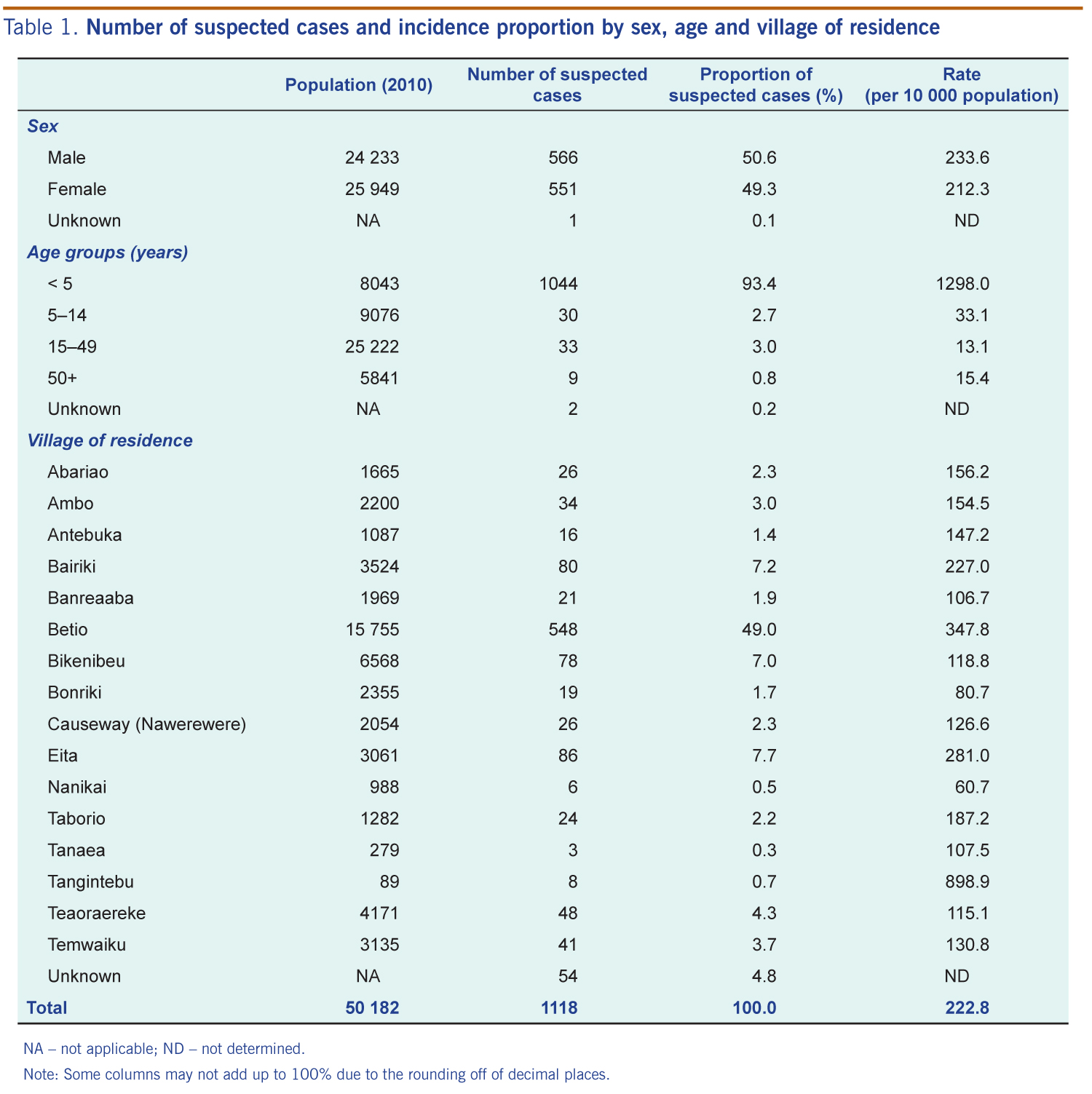 The majority of cases resided in the villages of Betio and Bairiki at the western end of South Tarawa and Tangintebu and Eita on central South Tarawa. The other 45.4% of cases resided in villages geographically dispersed along South Tarawa (Figure 1; Table 1).