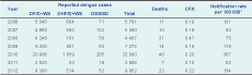 CFR – case fatality rate; DF/D–WS – dengue fever/dengue without warning signs; DHF/D+WS – dengue haemorrhagic fever/dengue with warning signs; DSS/SD – dengue shock syndrome/severe dengue.