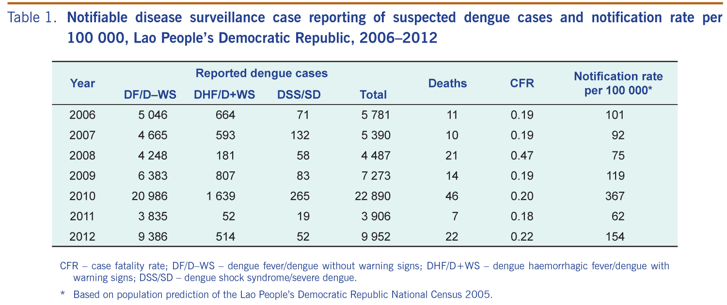 Khampapongpane B et al. National dengue surveillance in the Lao People’s Democratic Republic, 2006–2012: epidemiological and laboratory findings. Western Pacific Surveillance and Response Journal, 2014, 5(1):7–13. doi:10.5365/wpsar.2014.5.1.001
