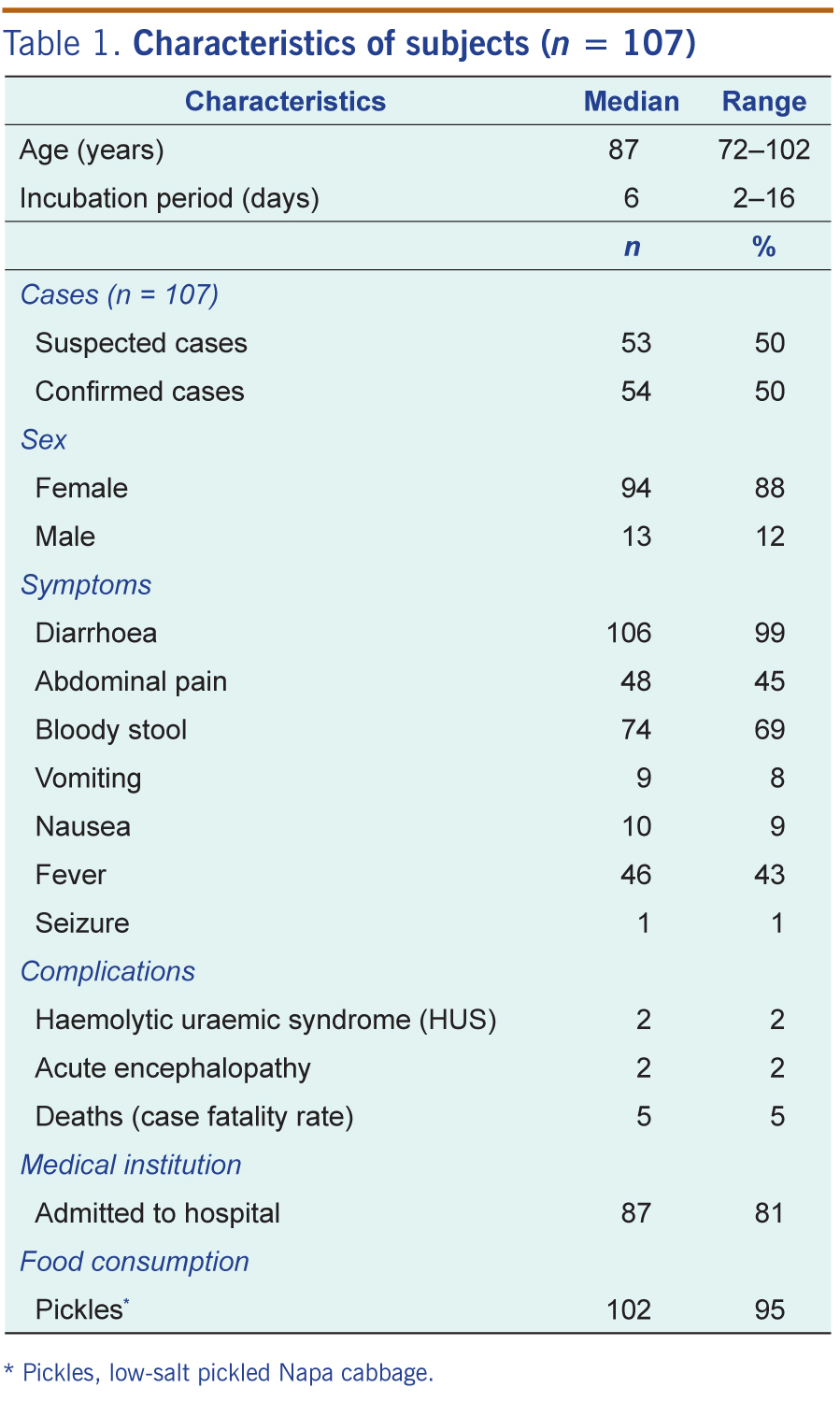 Of the 107 cases, 94 were women (88%) and the median age was 87 years (range: 72–102 years of age; Table 1). Among them, 106 (99%) reported diarrhoea and 74 (69%) had bloody stool. Two cases (2%) developed HUS and two (2%) developed acute encephalopathy. Five cases were fatal (case fatality rate: 5%); the median age was 95 years (range: 80–99 years of age). The onset of symptoms occurred during 3–17 August 2012, peaking on 7 August (Figure 1). No cases were reported after 17 August 2012. The median incubation period was six days (range: 2–16 days) from the time of exposure to the onset of gastrointestinal symptoms.