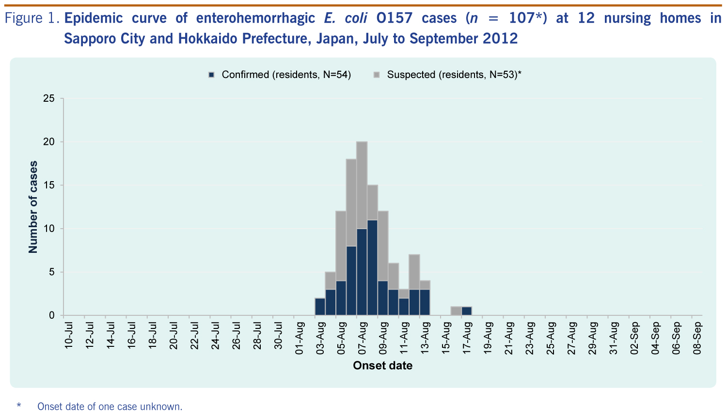 A suspected case was defined as a resident of a nursing home in Hokkaido with at least one of the following gastrointestinal symptoms: diarrhoea, bloody stool, abdominal pain or vomiting between 10 July and 10 September 2012. A confirmed case was a suspected case in which Shiga toxin 1 and 2 (stx1 and stx2)-producing EHEC O157 was detected in stool sample.
