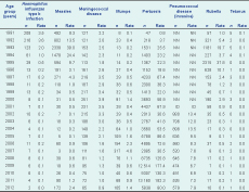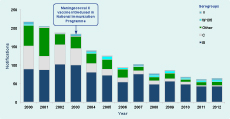 In 2012, two cases of Haemophilus influenzae type b infection were notified; this was the lowest number of cases notified within the last decade and the first time since the introduction of the vaccine in 1993 that no cases were notified in children less than five years of age (Table 1).