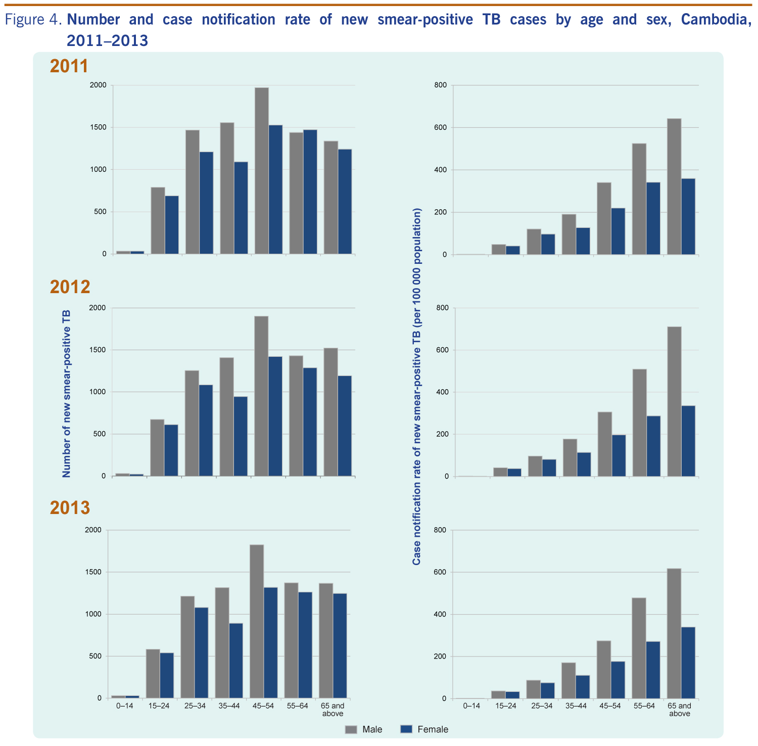 In every year from 2011 to 2013, the highest number of notifications of new smear-positive TB was reported in the 45–54 year age group (Figure 4). Males had higher sex-specific CNRs compared with females, especially in the older age groups; males had nearly twice the CNR rate as females in the same age group (Figure 4). The highest rate was found in males aged over 65 years in 2013 at 618 per 100 000 population, more than six times higher than the total CNR for 2013 at 94 per 100 000 population.