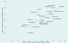In 2013, elderly people (aged 55 or over) accounted for 37% of new smear-positive TB notifications; CNRs of smear-positive TB in the elderly and non-elderly (people aged 54 or less) were 347 and 66 per 100 000 population, respectively. By province, there was a positive correlation between elderly and non-elderly CNRs (Pearson’s correlation coefficient 0.79, P < 0.001; Figure 7). There were some provinces that had very different CNRs in these two groups, including Rattanakiri (109 per 100 000 for the elderly and 37 per 100 000 for the non-elderly) and Odor Meanchey (533 per 100 000 for the elderly and 83 per 100 000 for the non-elderly).