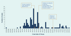 Data were entered and analysed using Microsoft Office Excel 2007. An epidemic curve used the date of onset of illness; if this was unknown, the date of blood sample collection. Attack rates and relative risk for exposure variables were calculated by medical areas. A spot map was used to assess cases by geographical areas.