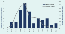 The trends of the measles cases reported through the routine indicator-based surveillance system and the rumours registered at the study HCs were compared (Figure 2). The rumours of measles followed a pattern similar to that of the measles cases reported through the routine surveillance system. For eight verified rumours on rabies/dog bites, only one case was reported as rabies. Five verified anthrax rumours were reported by EBS; however, only two cases were captured in the routine surveillance. For two verified rumours on suspected acute flaccid paralysis/polio and one on suspected neonatal tetanus, none of the cases was captured. Since pertussis was not a reportable disease, for the three rumours on whooping cough, none of the cases was captured in the routine surveillance.