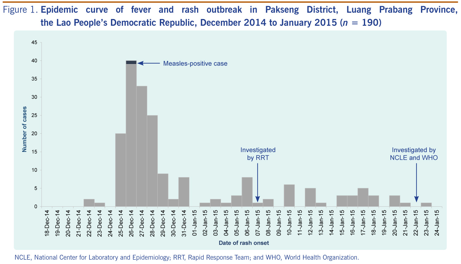 Background: In January 2015, the Lao People’s Democratic Republic Ministry of Health received a report of 34 cases of fever and rash with one laboratory-confirmed measles case in Houitone village, Pakseng District of Luang Prabang Province. Between 21 and 27 January, we conducted a field investigation to determine the etiology, magnitude and severity of this outbreak.