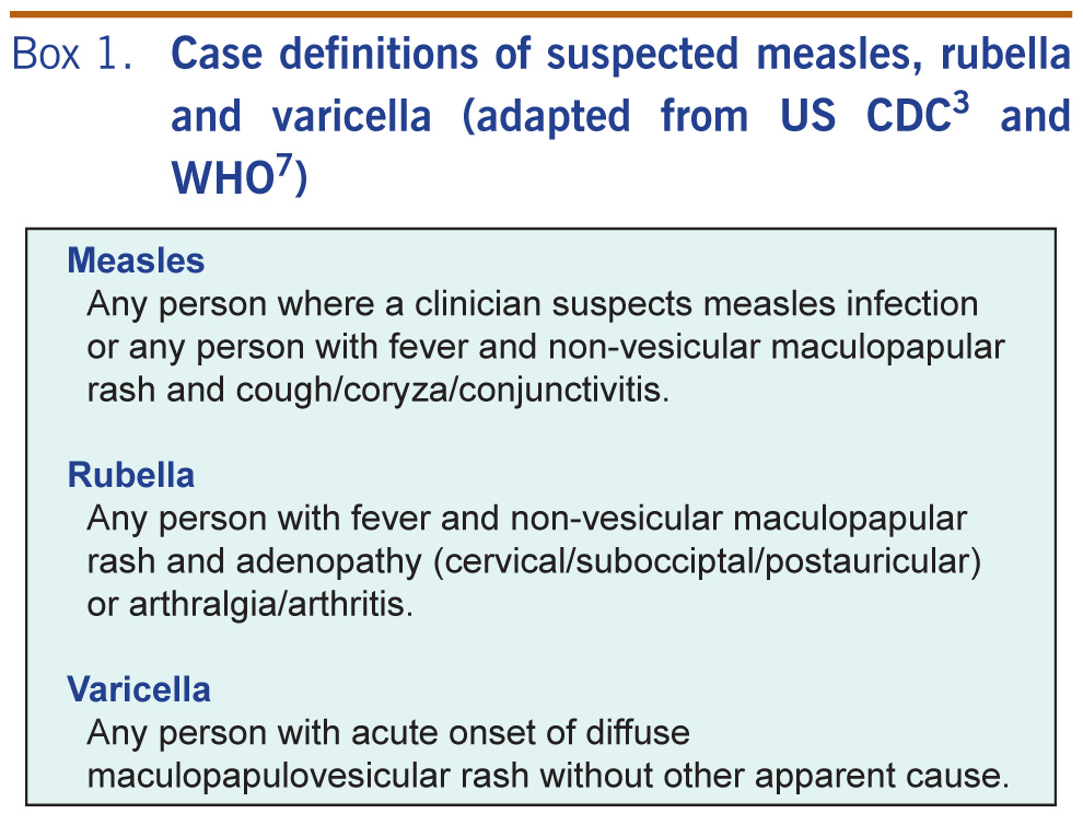 To differentiate between measles and varicella etiologies, information on rash types were collected with photographic documentation in 16 selected cases. Reinvestigation of the laboratory-confirmed measles case was also conducted. Cases were classified according to United States Centers for Disease Control and Prevention (US CDC) and WHO standard case definitions for varicella, measles and rubella (Box 1).3,7