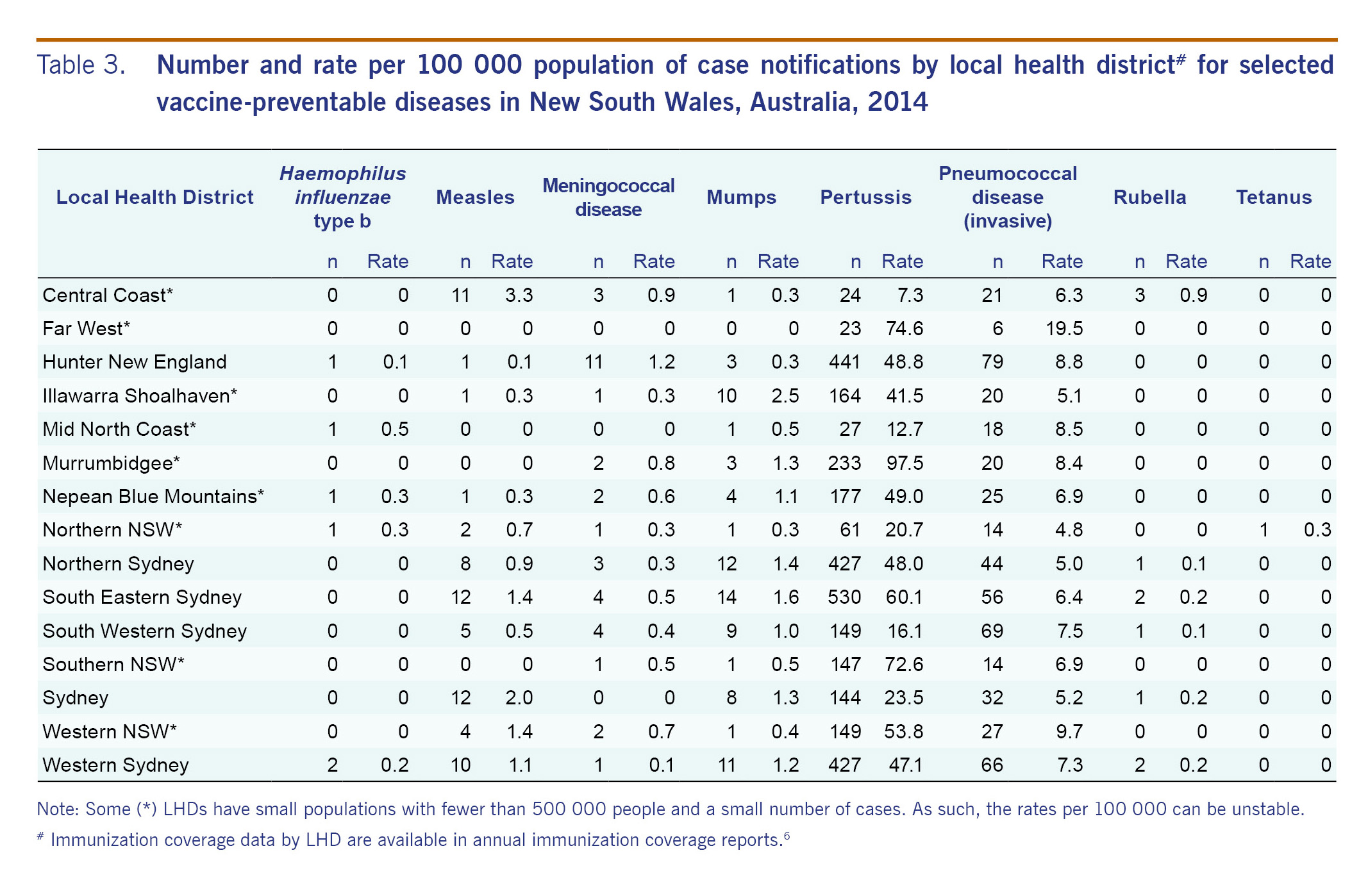 The highest rate of IMD (1.2 notifications per 100 000) was observed in the Hunter New England LHD (11 cases), with an unusually high proportion of serogroup Y (four of the 11 cases; 36.4%). This represents more than half of the seven serogroup Y cases in NSW in 2014. No epidemiological link was identified between the cases.
