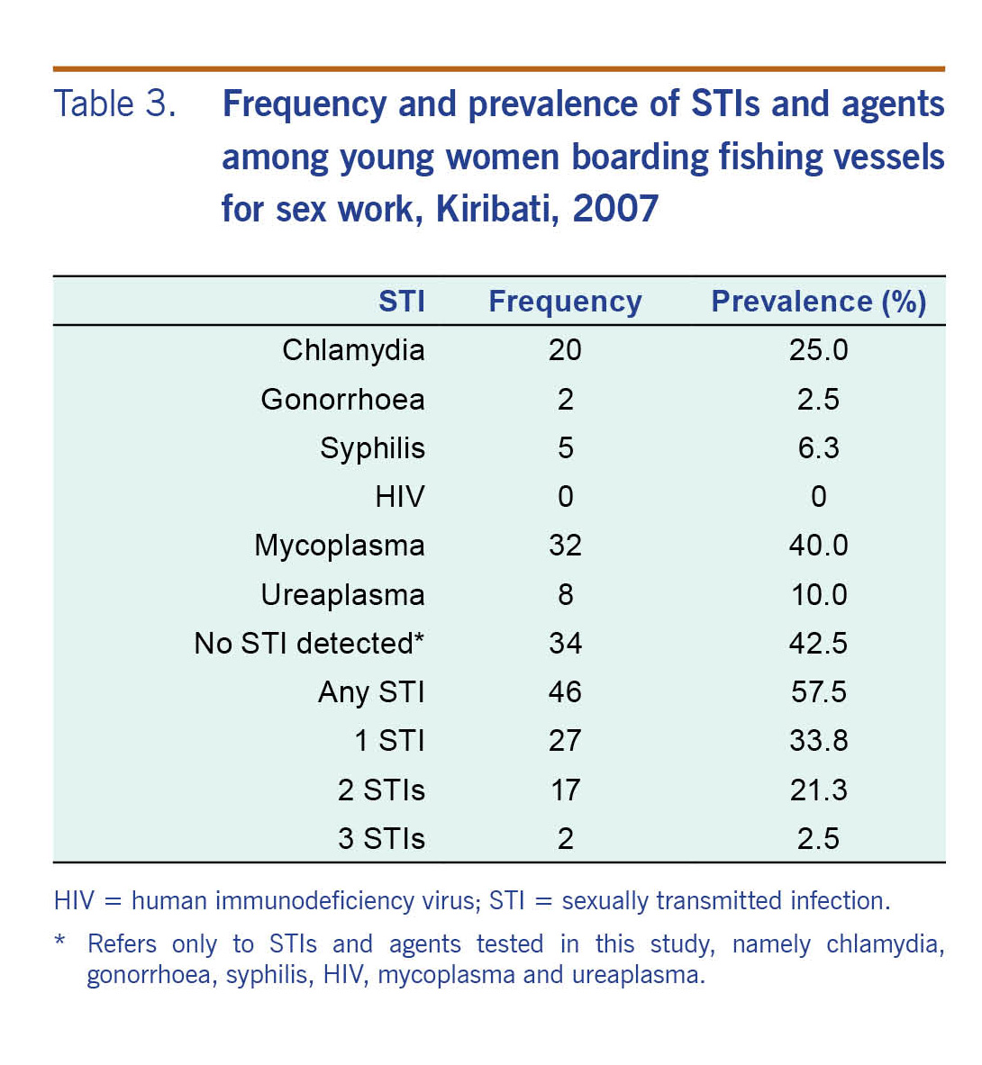 We developed a structured cross-sectional questionnaire and collected blood and urine samples. The questionnaire comprised 65 questions across 11 sections (see Annex 1), and it was also translated from English to Kiribati language. First, trained counsellors administered one-on-one interviews using the questionnaire with quantitative and qualitative items. During each interview, which lasted 20–30 minutes per participant, counsellors collected information on sociodemographic characteristics, behavioural risk factors for STIs and knowledge of and attitudes towards STIs and HIV. Second, urine and blood samples were collected. Serological testing of blood samples for HIV, syphilis and hepatitis B were conducted locally employing Abbott's Determine test kits (Abbott Laboratories, Tokyo, Japan). Reactive sera for syphilis were referred to the South Eastern Area Laboratory in Sydney, Australia for confirmatory Treponema pallidum particle agglutination assays and fluorescent treponema absorbance tests. In addition, frozen urine samples were referred for polymerase chain reaction testing for Chlamydia trachomatis, Neisseria gonorrhoeae, Mycoplasma hominis and Ureaplasma urealyticum.