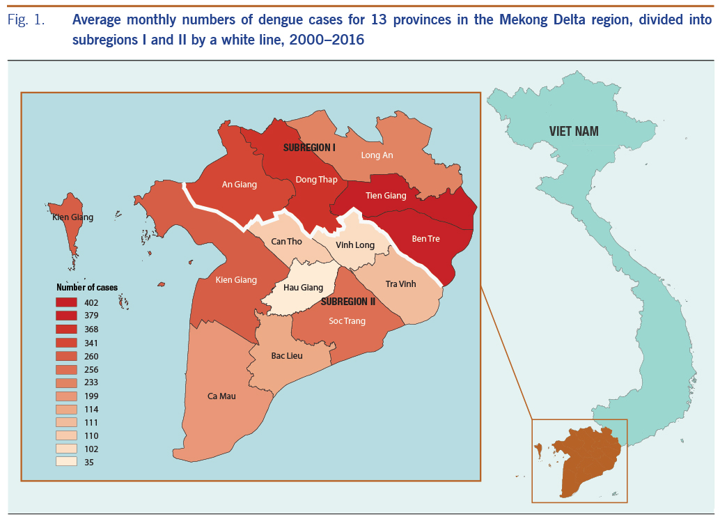 The study was conducted in the lower MDR in south-western Viet Nam, using the average monthly number of dengue cases (Fig. 1). The MDR reported up to 65% of the total cases of dengue in Viet Nam during the period 2000 to 2016. This is a flat and low-lying area of 40 576 km2 covering 13 provinces within a complex network of rivers, channels and floodplains. We divided this region into two subregions: subregion I has the higher dengue incidence provinces (An Giang, Dong Thap, Long An, Tien Giang and Ben Tre) and subregion II has the lower incidence provinces (Vinh Long, Tra Vinh Can Tho, Hau giang, Soc Trang, Bac Lieu, Kien Giang and Ca Mau), separated by a white line in Fig. 1. Dengue fever has been recorded as the second most frequent reason for hospitalization among communicable diseases in this region.16