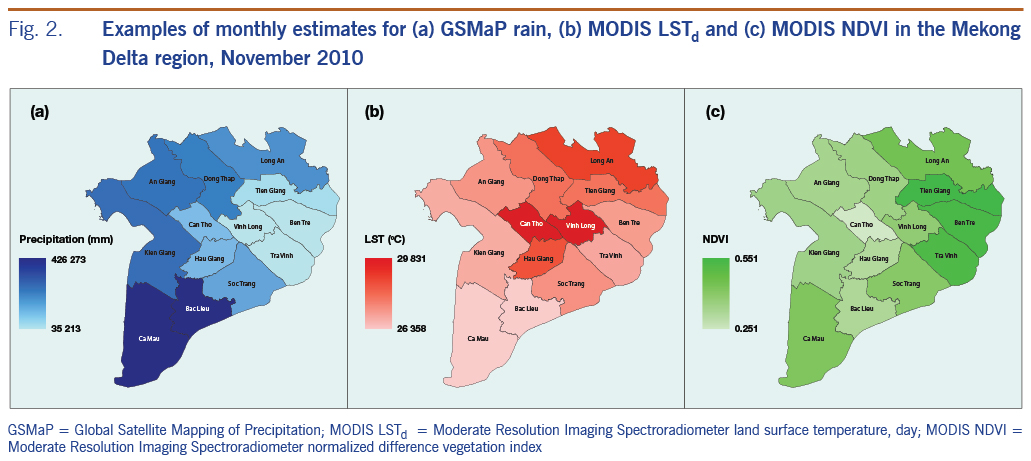We used GSMaP data as an alternative for surface rainfall measurement in an attempt to expand the use of remote sensing data with the advantages of spatial coverage with high resolution and temporal availability. The daily GSMaP-version 6 data17 with a spatial resolution of 0.1 × 0.1 degrees were extracted and accumulated to calculate monthly rain. We used monthly land surface temperature data from MODIS LSTd and LSTn (MOD11A2)18 with a 1 km spatial resolution as a proxy for air temperature. In addition to climate variables, one of the most commonly used remote sensing–derived environmental variables, the normalized difference vegetation index (NDVI) from MODIS (MOD13Q1) with a 250 m spatial resolution, was also used in the model for its influence on dengue.19 These remote sensing–based parameters were aggregated to compute mean monthly variables for each province as examples presented in Fig. 2, showing clear spatial variations among provinces and between variables.