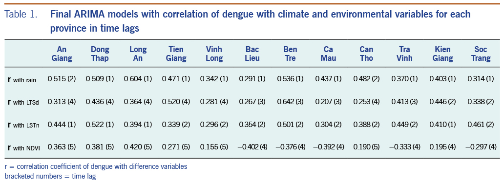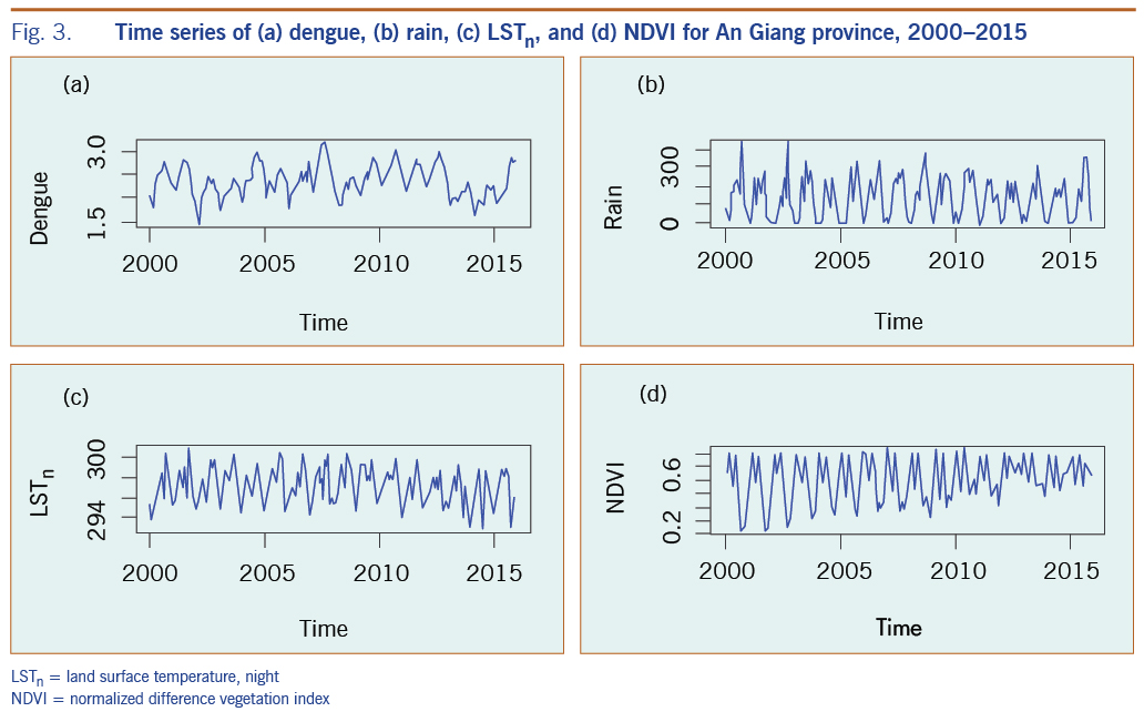 Several investigators have examined the associations among climate variables, demography and dengue incidence in the southern provinces of Viet Nam using a wavelet time series analysis,3,32 a standard multiple regression model, ARIMA and a Poisson distributed lag model.33 We found that time-series analysis was useful in establishing the relationship between the change of weather parameters, environmental factors and the incidence of dengue diseases for the entire MDR. Input variables were selected based on the best correlation of dengue with precipitation, LSTd, LSTn, and NDVI data, for the period 2000 to 2015 at varying time lags as in previous studies.<19,33