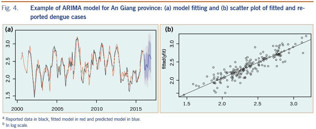 Fig. 4a presents an example of an ARIMA fitting model plot for An Giang province and the comparison of fitted with reported dengue cases; Fig. 4b shows the regression function with its root mean square error value for the fitted period of 2000–2015. The final model for each province was confirmed by the Ljung-box test27 of the residual with no correlation for fitted data.