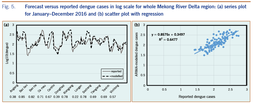The best time-series ARIMA model with final independent variables found for each province was applied to predict dengue for the period from January to December 2016. In most cases, rain and LSTn remained in the final model; LSTd and NDVI were occasionally removed when correlations were less than 0.25. We compared predicted dengue with reported cases for the whole MDR, as shown in Fig. 5. The results showed that predicted dengue in every province closely followed the trend of reported data (Fig. 5a) and that these data are in good linear regression with the square of correlation of 0.65 for the whole region (Fig. 5b).