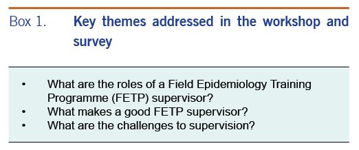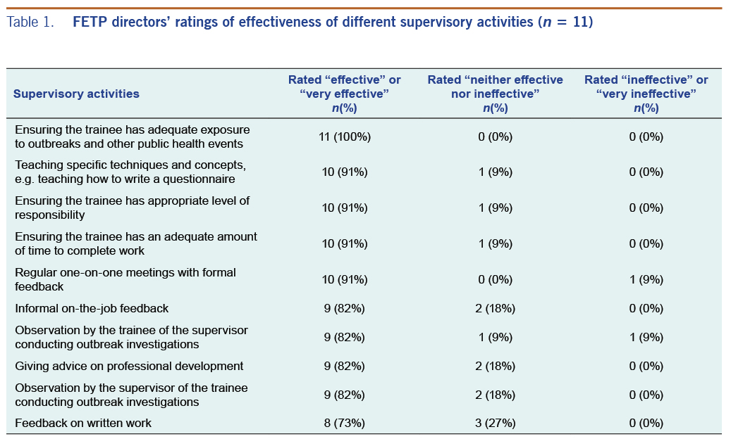 Workshop and survey results indicated that FETP directors and supervisors had a high level of confidence in the value and effectiveness of FETP supervisors. Participants identified several key components to effective supervision, including interpersonal and communication abilities, relevant training background and technical skills and time and availability for frequent in-person contact with trainees. We found several areas to improve the structure and practice of supervision in FETPs.
