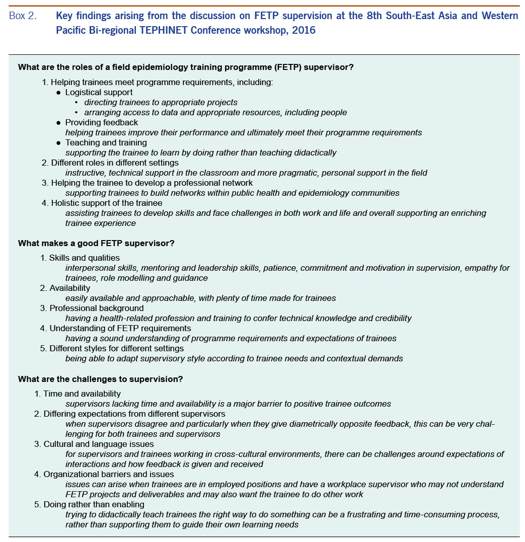 Despite the central role of supervision in FETPs, there is little published evidence on best practice in FETP supervision. Existing FETP guidelines largely focus on the logistical aspects of supervision with limited consideration of the broader qualities and activities that are important for effective supervision.3,6 Programme experiences from the Asia-Pacific and other regions highlight issues related to FETP supervision such as a lack of adequate epidemiology knowledge among workplace supervisors,6,7 and the interest in professional training in supervisory techniques.7 A more comprehensive body of peer-reviewed evidence exists for other professions where supervision is a key component, such as health-care worker training that takes place in clinical settings.8,9 Some of this literature may also be applicable to the FETPs, including the importance of integrating theoretical knowledge with practical experience10 and recognizing the value of a holistic supervisory role, including interpersonal skills, nurturing and guiding alongside teaching specific skills and content knowledge.8 However, none of the literature captures the particular needs and expectations of FETP supervisors.