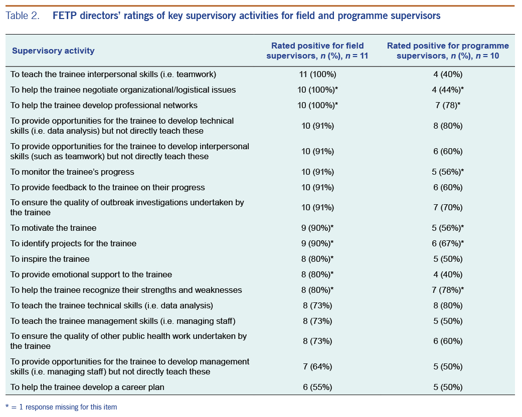 FETP directors perceived the supervisor’s level of public health knowledge as the most critical quality for effective supervision (Table 3). Similarly, their technical skills were also seen as highly important along with a range of more holistic qualities including enthusiasm, interpersonal skills, approachability and availability.