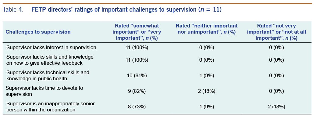 Overall, FETP directors appeared to have a high degree of recognition of the value of supervisors for effective FETP training. The majority of FETP directors (55%) perceived the role of the supervisor as being “very effective” in facilitating the development of competent field epidemiologists; the remainder rated the supervisor’s role as “effective”.