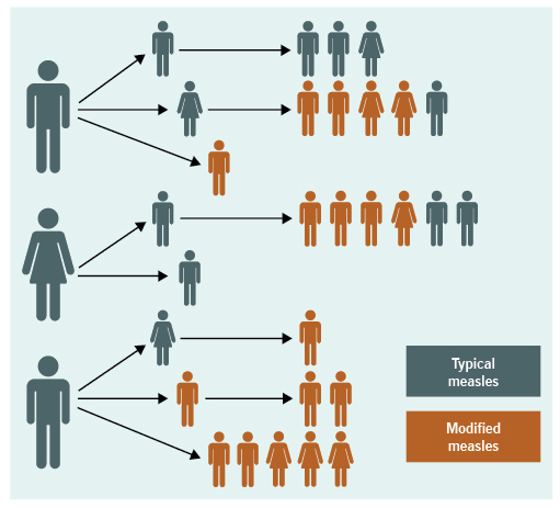 More than half of the cases (55%) in this outbreak were classified as modified measles, which is considered to have lower transmission potential.4 This is consistent with our observation that most of the patients who gave rise to secondary cases presented with clinically typical measles.