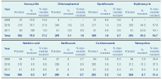 The proportion of isolates showing either complete or intermediate resistance to tetracycline rose from 27.8% (10/36) in 2009 to 50.5% (107/212) in 2010 before decreasing to 11.8% (6/51) in 2011. Isolates were not tested for erythromycin resistance in 2009, but in 2010 and 2011, 92.1% (187/203) and 96.1% (49/51) of the isolates showed intermediate or complete resistance, respectively.